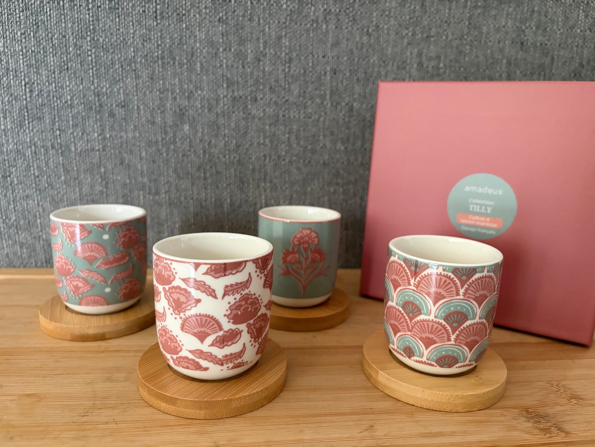 Coffret de 4 tasses expresso en porcelaine fine, idéal pour enrichir une gamme de vaisselle haut de gamme. Chaque tasse est accompagnée d’une soucoupe en bois clair, apportant une touche naturelle et élégante. Dimensions compactes (6x6x3 cm) adaptées à un usage café expresso.