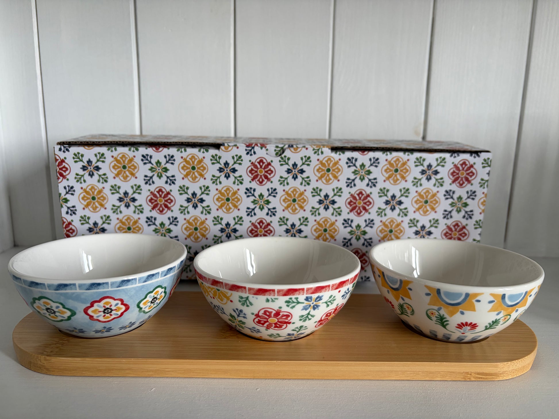 Coffret apéritif comprenant un plat en bois clair et trois bols en porcelaine fine, décorés de motifs colorés variés.