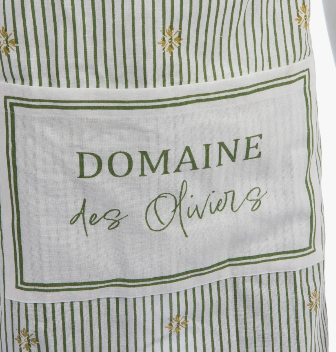 The apron features a striped pattern with floral accents and a printed front pocket. The oven mitt and pot holder, meanwhile, offer a harmonious blend of gingham and geometric patterns.