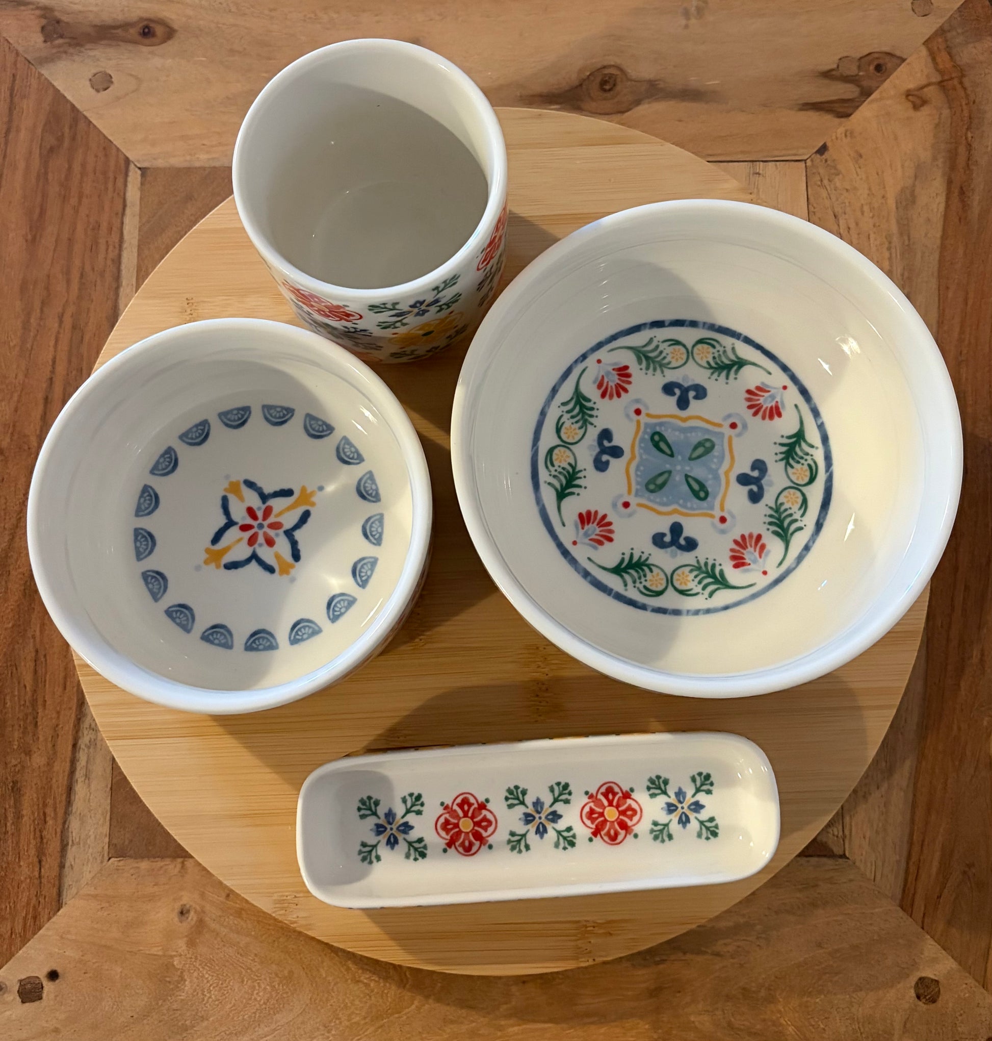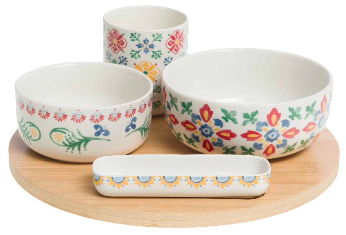 Coffret apéritif comprenant un plat et quatre bols, présentés sur un plateau tournant en bambou, alliant élégance et praticité pour vos moments conviviaux.