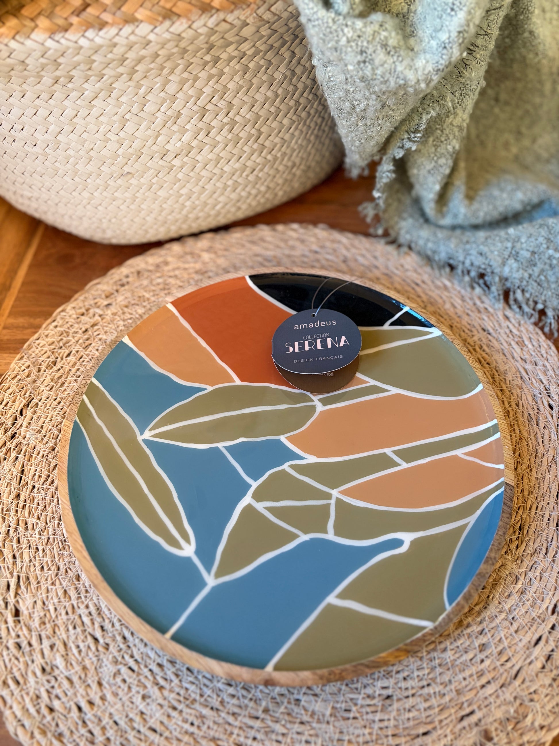 Plat rond en bois de manguier, idéal pour la présentation et le service. Ce modèle coloré et décoratif apporte une note artisanale et naturelle.