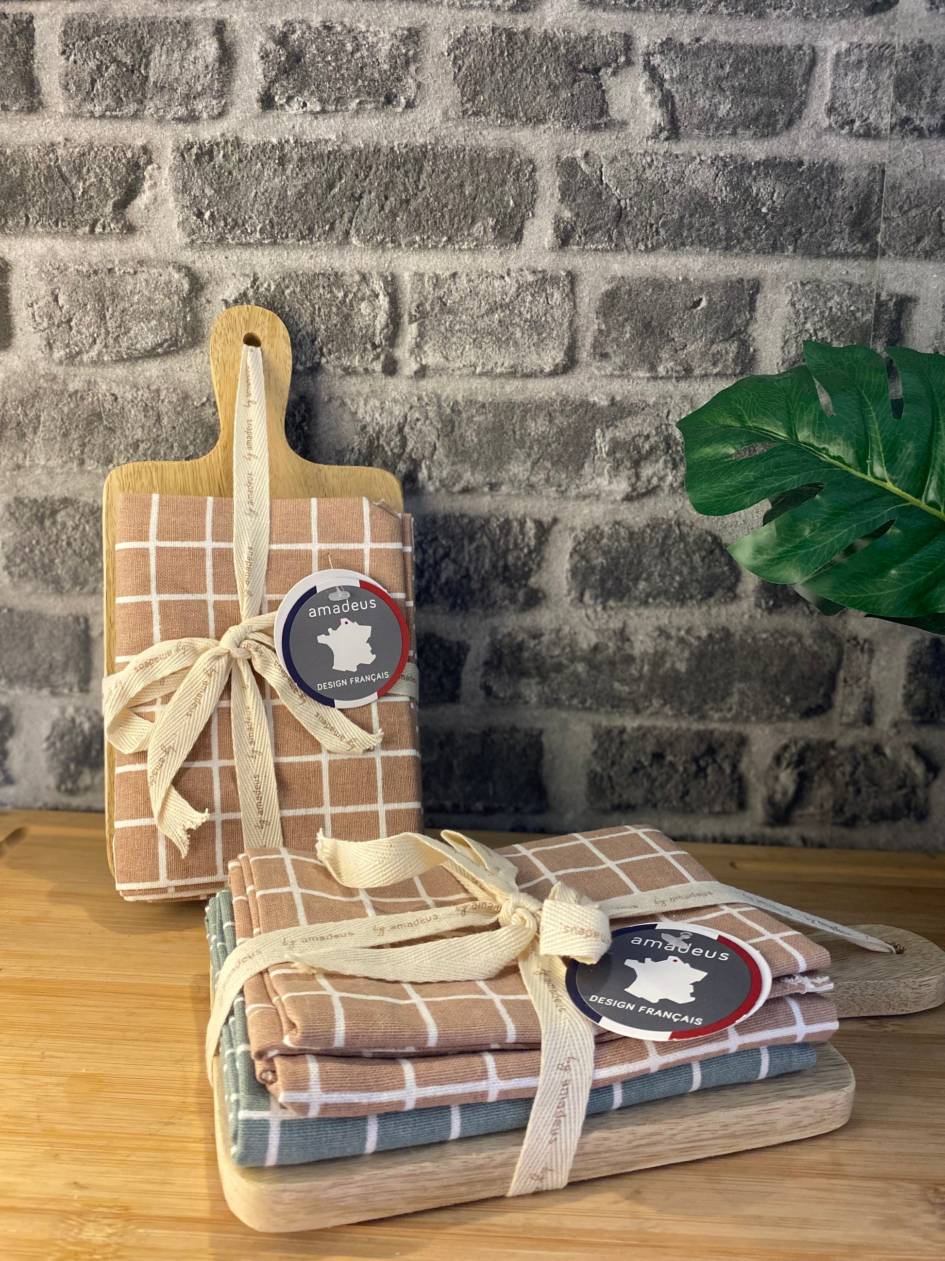Lot composé de deux torchons 100 % coton et d’une planche à découper en bois naturel. Pratique et esthétique, cet ensemble s’intègre parfaitement à une collection de linge de cuisine et d’ustensiles. Ses dimensions sont adaptées à un usage quotidien, et son design simple accompagné de couleurs douces en fait un ajout à la fois utile et décoratif.