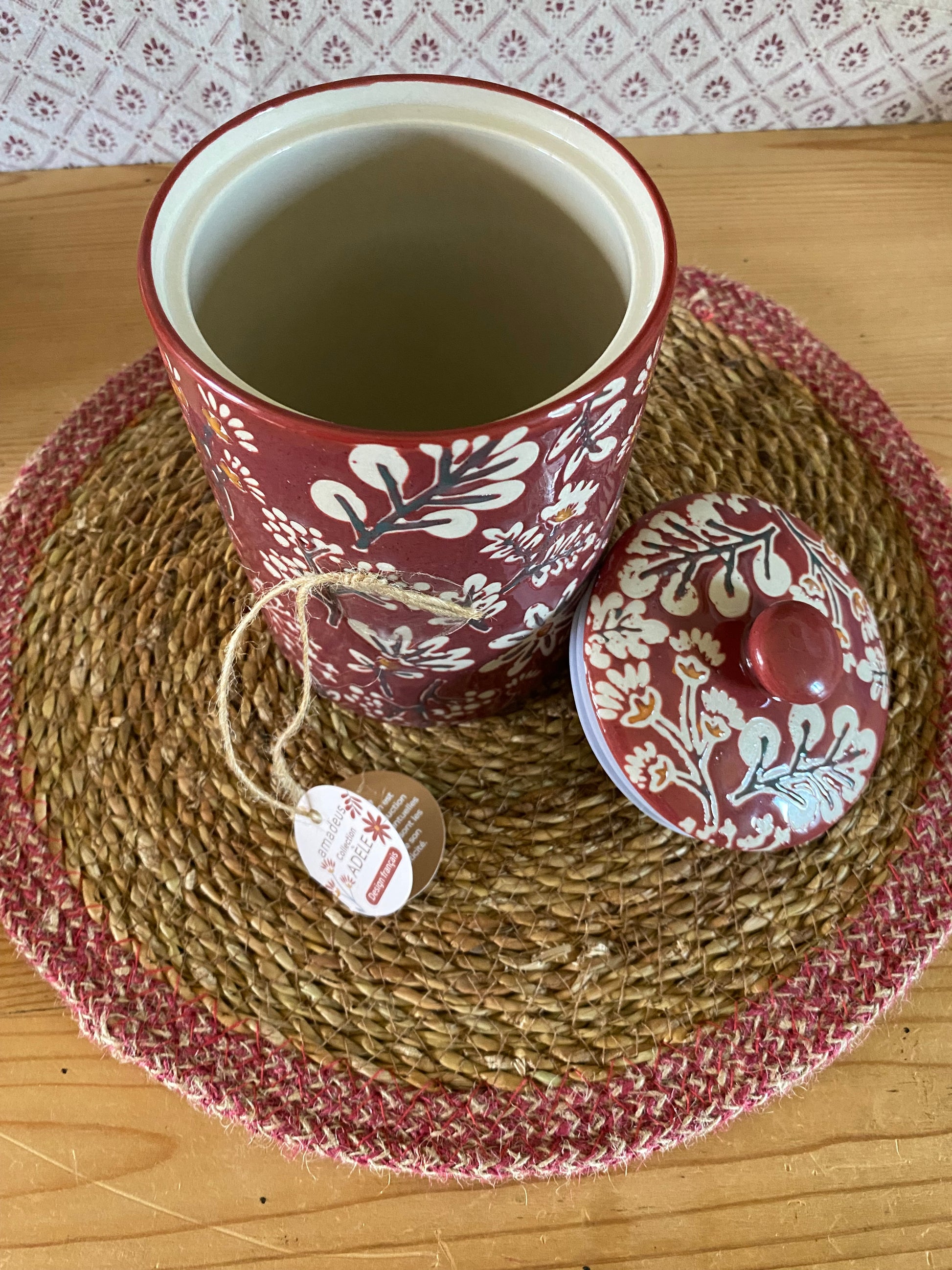 Pot hermétique en grès, idéal pour le stockage alimentaire. Sa finition décorative florale sur fond bordeaux apporte une touche esthétique. Il garantit une bonne conservation grâce à son couvercle hermétique.